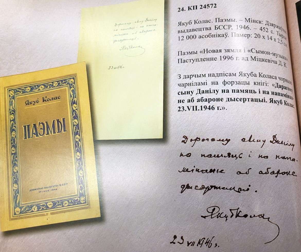 На гэты раз – пра ўнікальнае музейнае выданне, першы каталог «Ад усяго сэрца, ад усёй душы. Дарчыя надпісы Якуба Коласа на кнігах». Менавіта з такім цёплым пасылам падпісваў Канстанцін Міхайлавіч свае творы чытачам, сярод якіх – пісьменнікі, дзяржаўныя дзеячы, сваякі, студэнцкая моладзь, настаўнікі, вучні. У фондах музея класіка захоўваецца каля сотні такіх аўтографаў. І за кожным з іх – свая гісторыя.