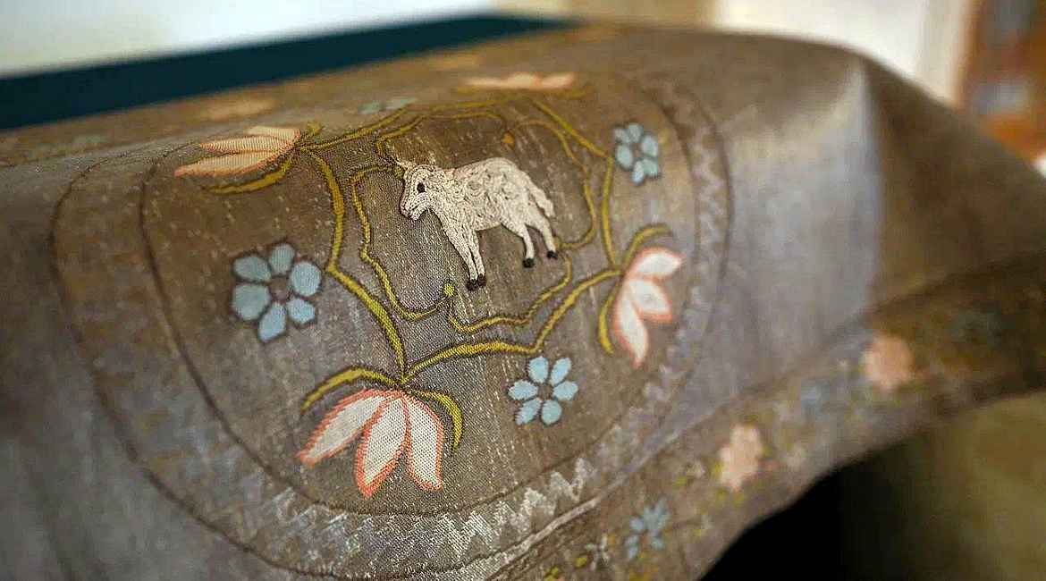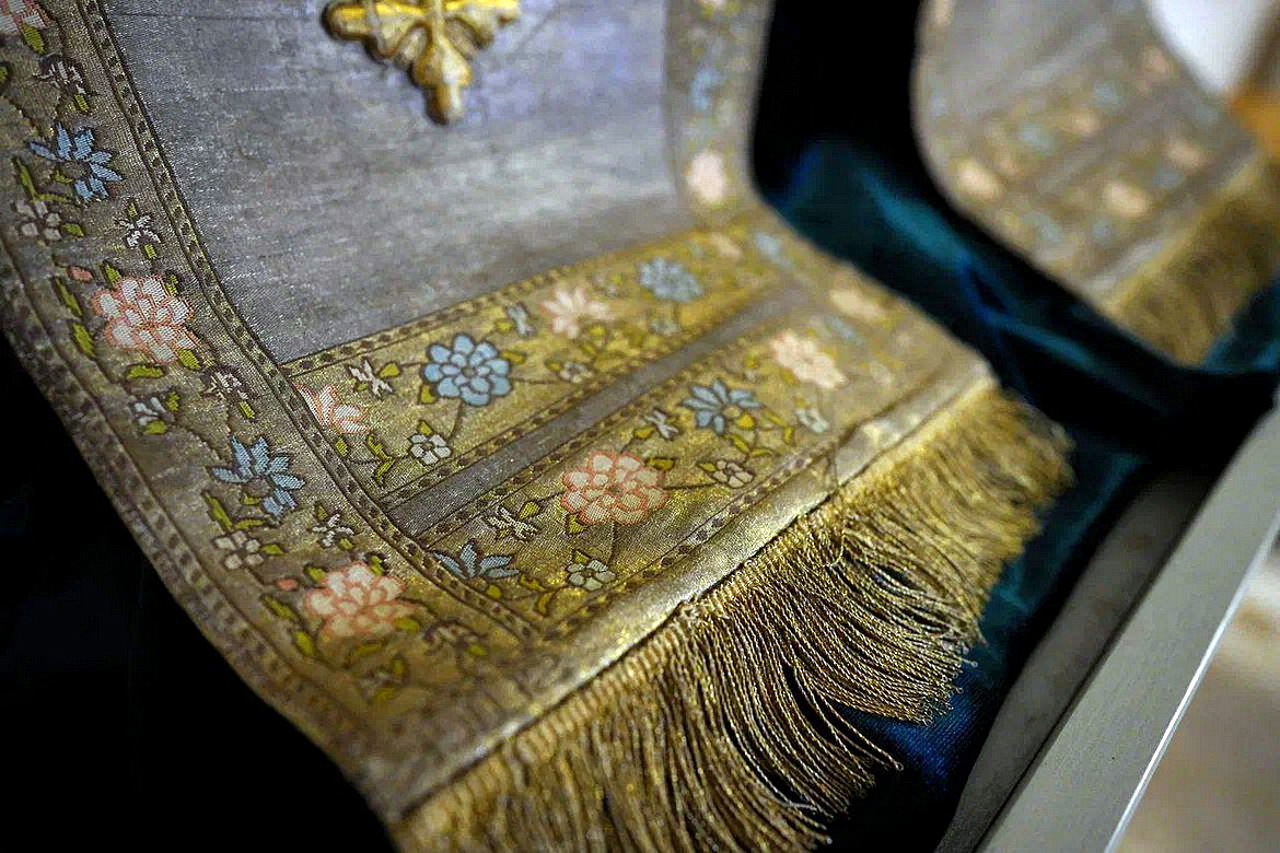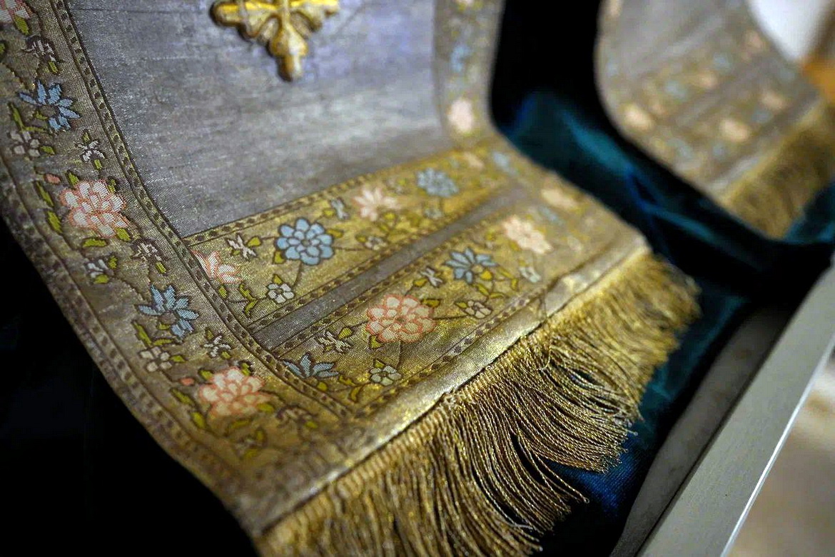 Омофор выткан в 1785 году на известной слуцкой фабрике – «персиарне» армянских ткачей Яна и Леона Маджарских, которая широко прославилась благодаря слуцким поясам. Мастера создавали и шедевры церковного искусства.