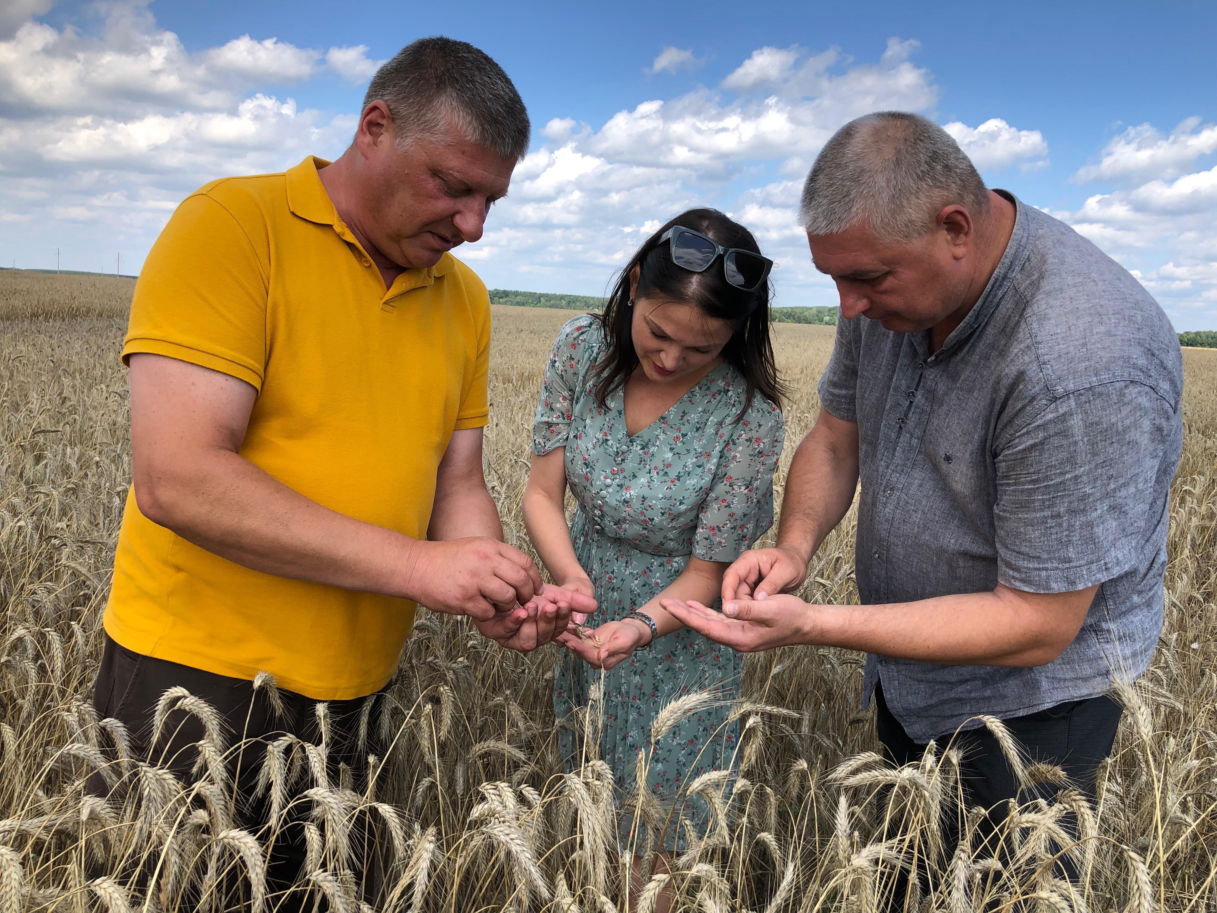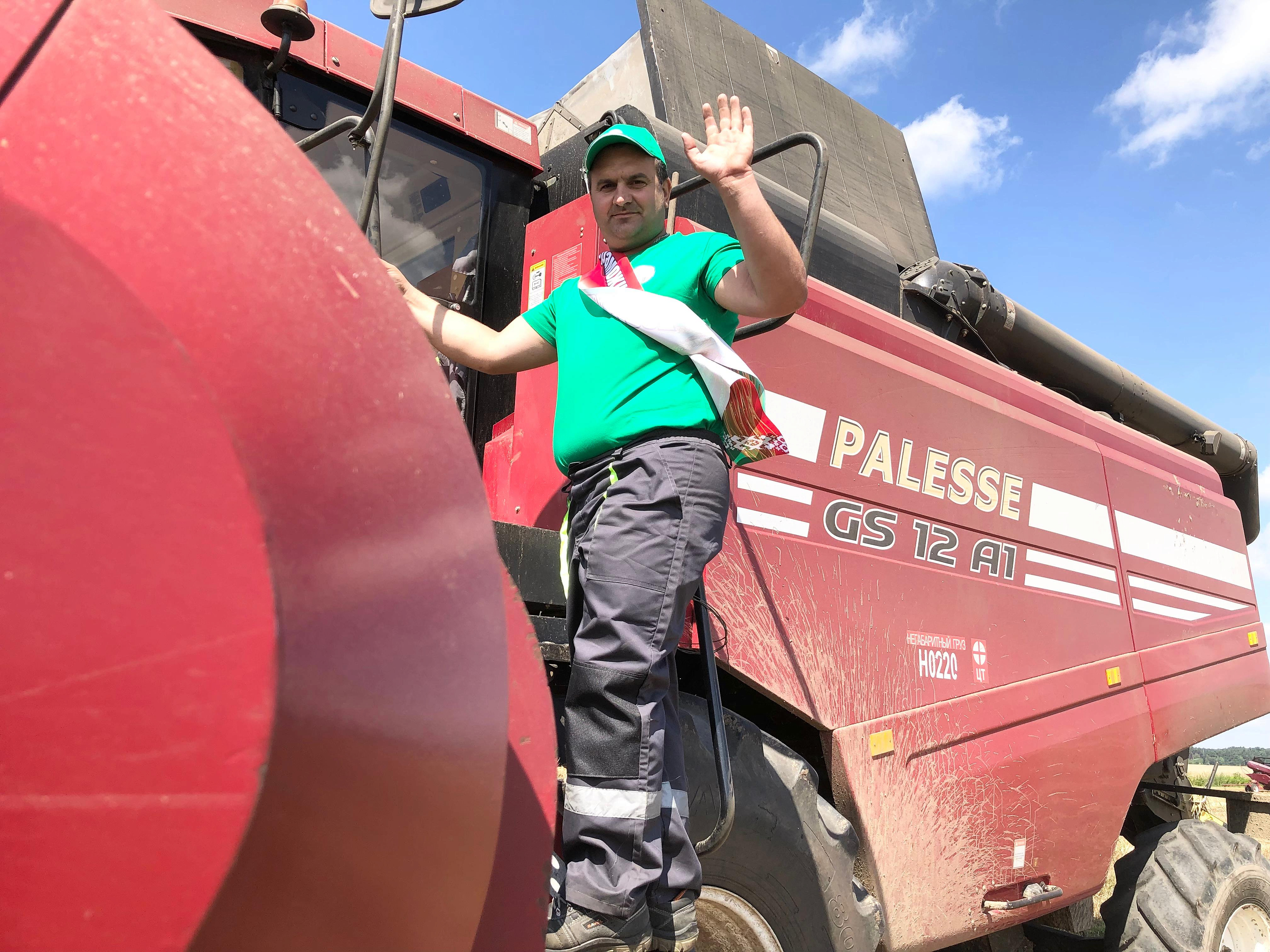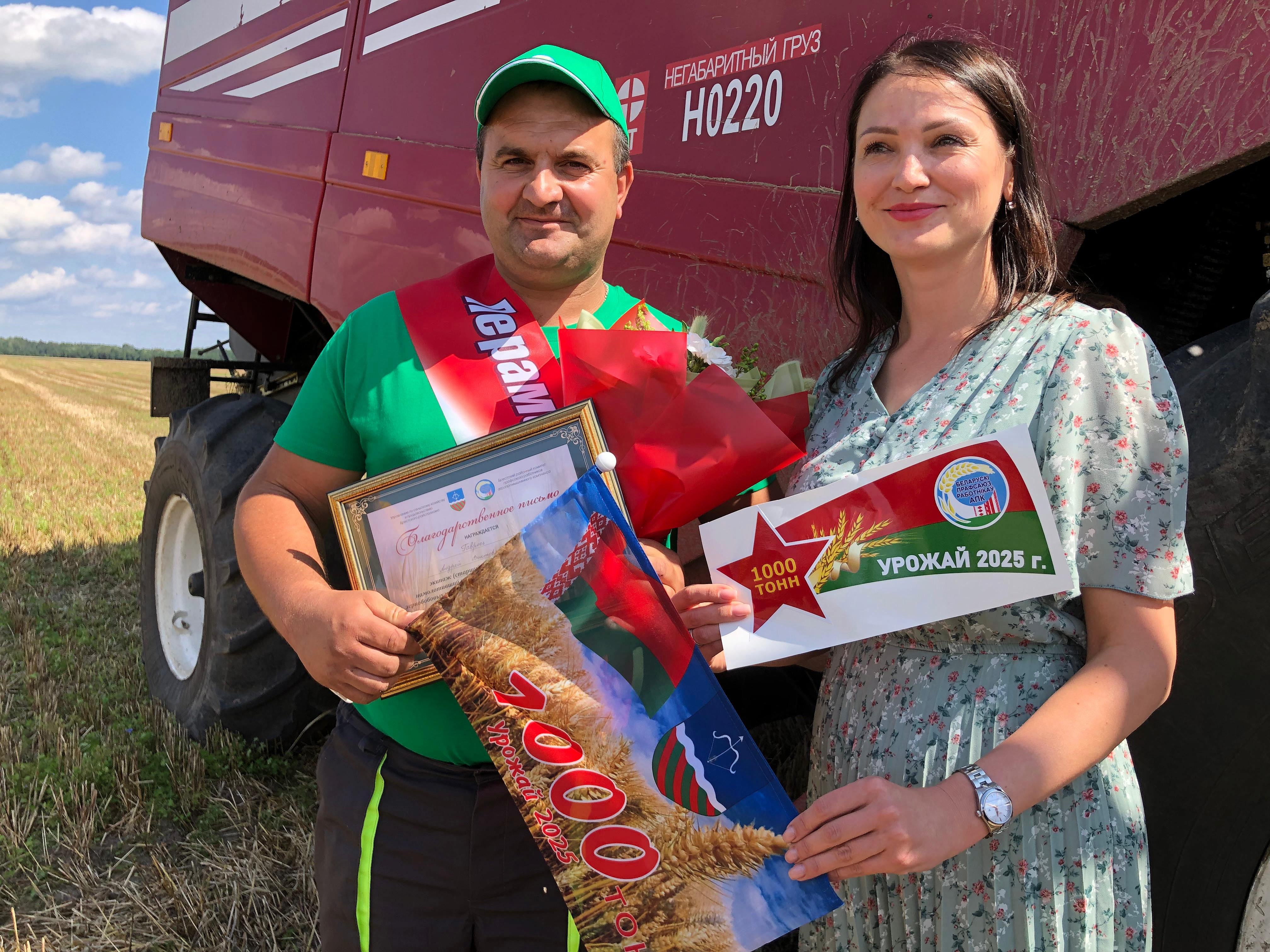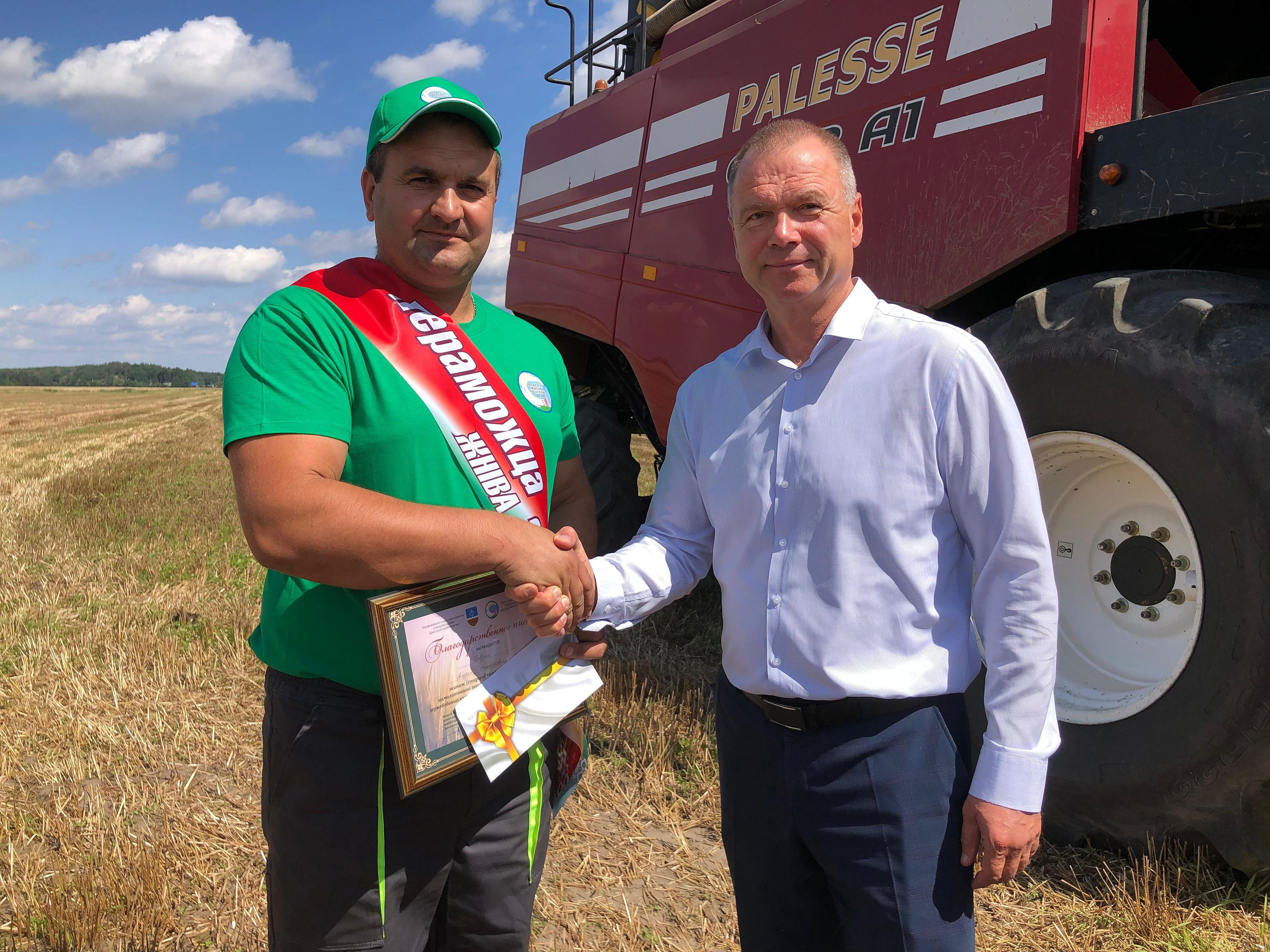 Фота і відэа: Андрэй Гаўрусь, старшы камбайнер ААТ «Дубравушка-Агра» Брэсцкага раёна, Аксана Лашкевіч, начальнік аддзела вытворчасці прадукцыі раслінаводства і кормавытворчасці Брэсцкага абласнога камітэта па сельскай гаспадарцы і харчаванні, Віталь Няхань, загадчык збожжасушыльнай гаспадаркі ААТ «Дубравушка-Агра» Брэсцкага раёна, Уладзімір Сянчук, старшыня Брэсцкага райвыканкама.