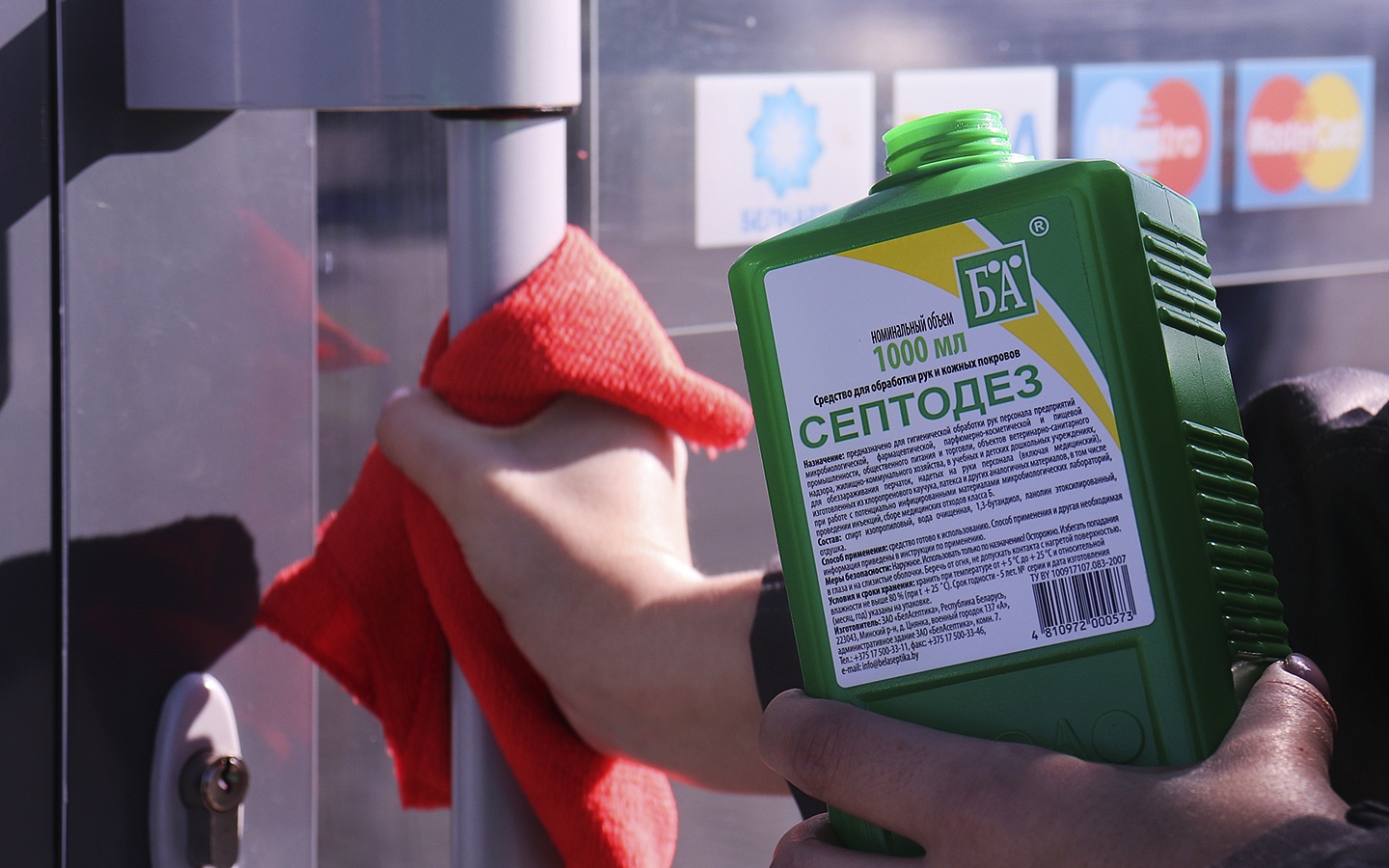 Пад’язджаючы да 78-ай запраўкі «Беларуснафты» бачым, як працаўнікі дэзінфіцыруюць дзвярныя ручкі. Дарэчы, санапрацоўка праходзіць кожныя дзве гадзіны, і не толькі ў памяшканнях, але і на палівараздатачных калонках. Майстар 78-ай АЗС Ігар Кузняцоў адзначыў, нягледзячы на дадатковую адказнасць, заправачная станцыя працуе ў штатным рэжыме.